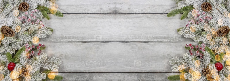 С Новым 2022 годом. Красивый рождественский баннер с боке. Еловые ветки, шишки, красные ягоды на сером деревянном фоне. Празднование рождественских праздников. Концепция начала года
