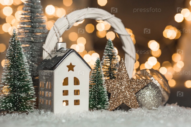 С Новым 2023 годом. Красивый фон с домом, снегом и елками в скандинавском стиле. Празднование зимних рождественских каникул. Концепция начала года
