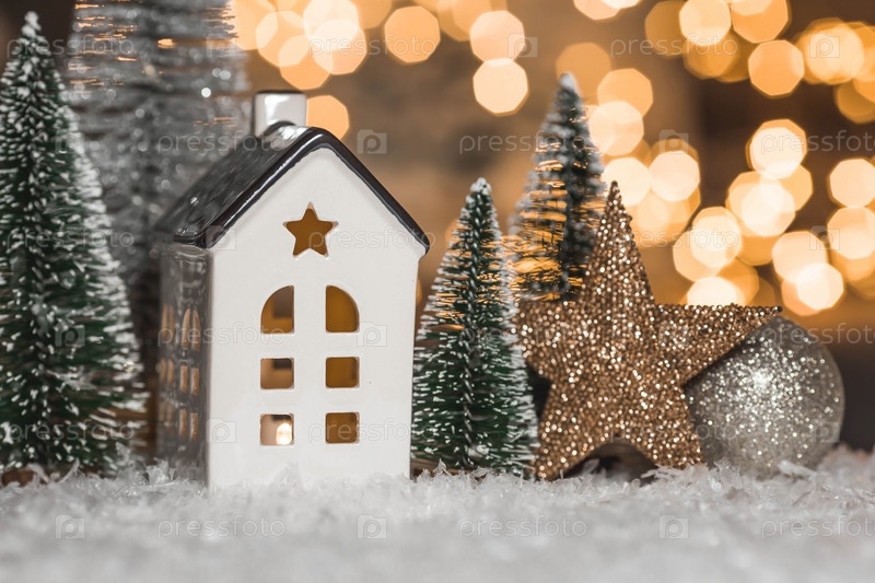 С Новым 2023 годом. Красивый фон с домом, снегом и елками в скандинавском стиле. Празднование зимних рождественских каникул. Концепция начала года