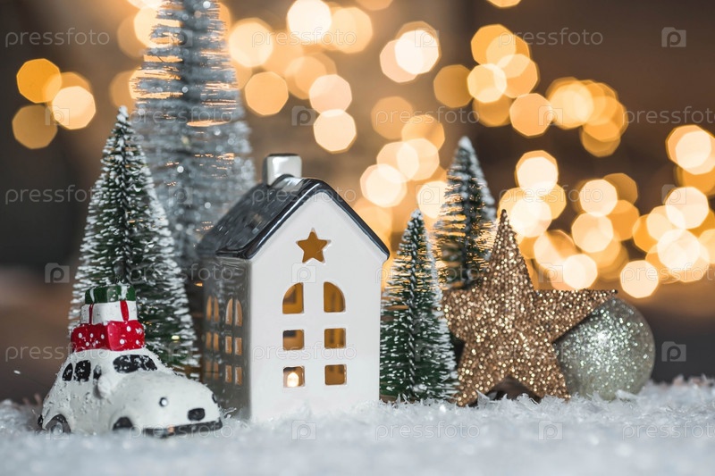 С Новым 2023 годом. Красивый фон с домом, снегом и елками в скандинавском стиле. Празднование зимних рождественских каникул. Концепция начала года