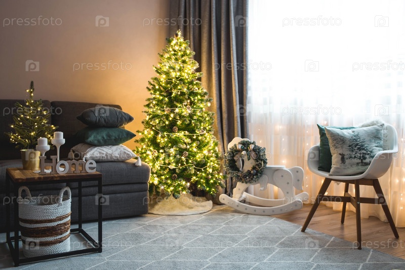 Уютный декор в серо-зеленых тонах в интерьере новогодней комнаты, украшенная гирляндами елка, подарки, деревянная лошадка. Праздничная гостиная в доме. Новогодние праздники 2023