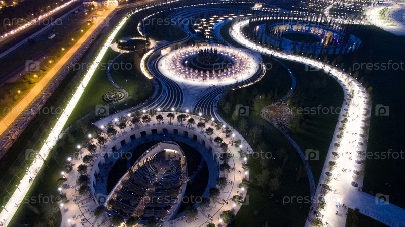 Краснодар. Россия. 8 октября 2017 г. Современный футбольный стадион "Краснодар" на фоне нового общественного парка ночью сверху