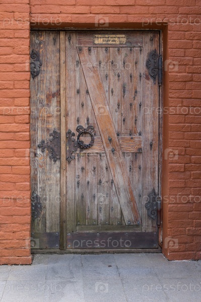 Деревянная дверь на каменной стене с табличкой