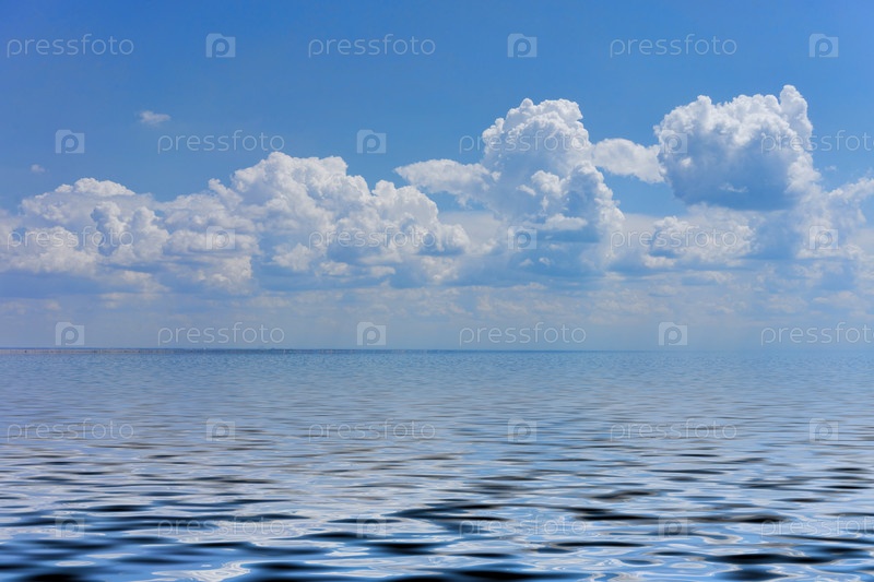 Морской пейзаж с большим галечным пляжем и синим морем до горизонта