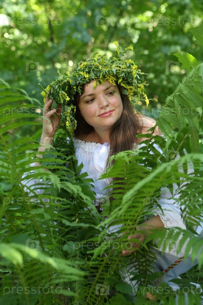 Девушка в венке и сарафане в папоротниковых зарослях в лесу