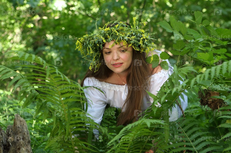 Девушка в венке и сарафане в папоротниковых зарослях в лесу