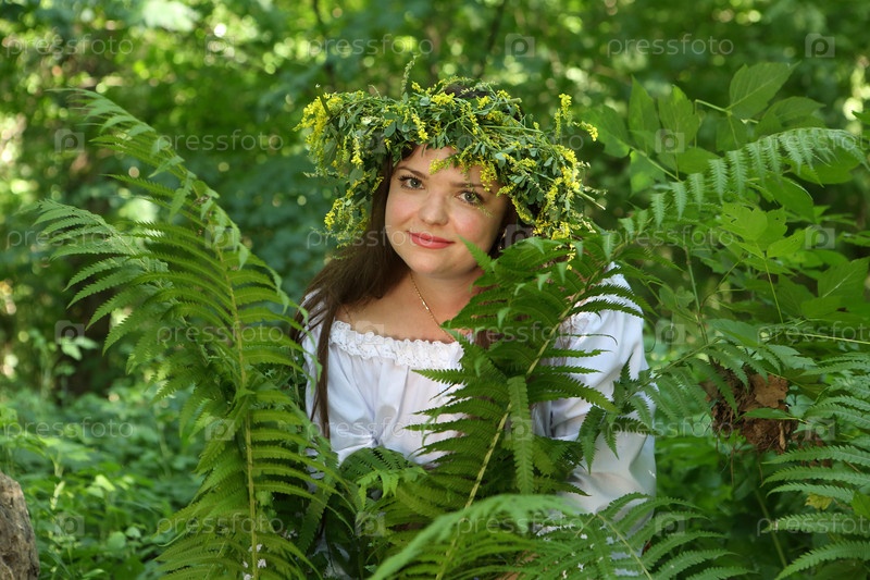Девушка в венке и сарафане в папоротниковых зарослях в лесу