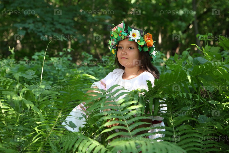 Девушка в венке и сарафане в папоротниковых зарослях в лесу