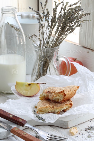 Натюрморт с яблочным пирогом,молоком и букетом лаванды на белом фоне