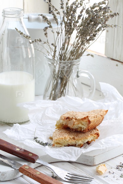 Натюрморт с яблочным пирогом,молоком и букетом лаванды на белом фоне