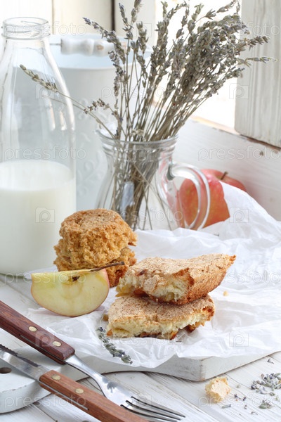 Натюрморт с яблочным пирогом,молоком и букетом лаванды на белом фоне