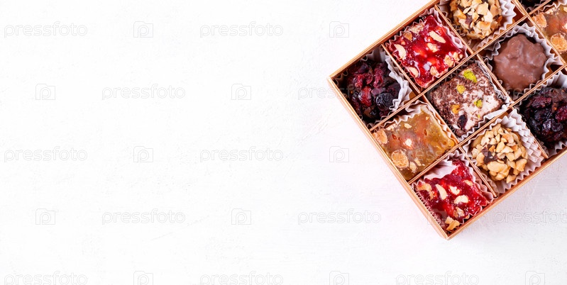 Веб-баннер с рахат-лукумом в коробке. Красочная кондитерская вариация. Восточный десерт. Макет с копией пространства на белом фоне