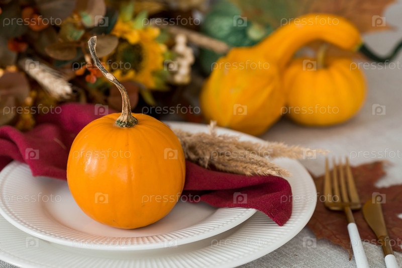 Красивая осенняя сервировка стола. Тарелка с хлопчатобумажной салфеткой и тыквой. Столовое золото и ваза с осенними цветами на льняной скатерти. Концепция праздничной сервировки на День Благодарения