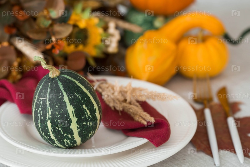 Красивая осенняя сервировка стола. Тарелка с хлопчатобумажной салфеткой и тыквой. Столовое золото и ваза с осенними цветами на льняной скатерти. Концепция праздничной сервировки на День Благодарения