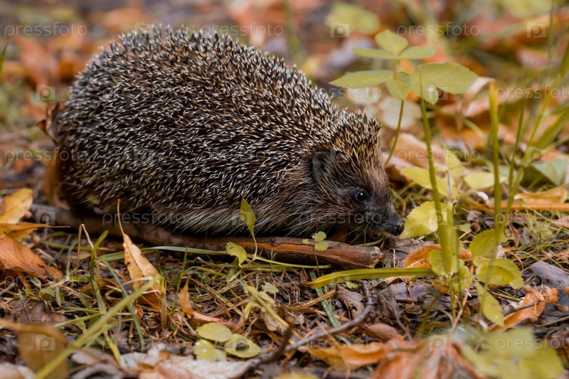 Животные и окружающая среда. Ежа. Дикая, местная, европейская ежа осенью в парке. Научное название: Erinaceus Europaeus. Размытый фон
