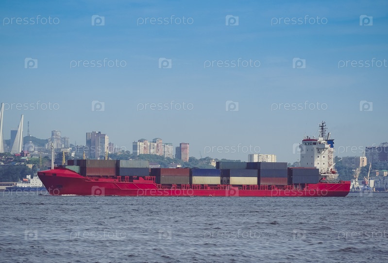 Морской пейзаж с красным контейнеровозом на фоне города