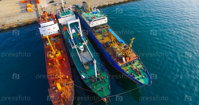 Воздушный обзор береговой линии острова Русский с причалом и кораблями
