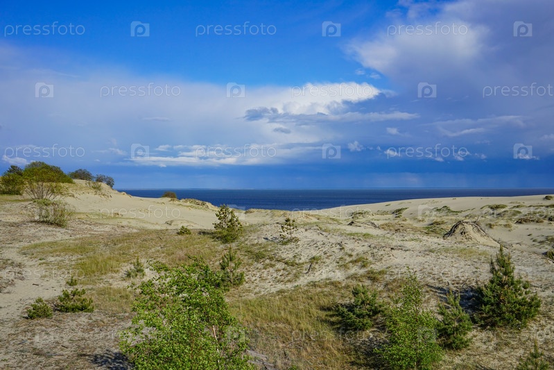 Морской пейзаж Балтийского моря с прибрежными песчаными дюнами Куршской косы