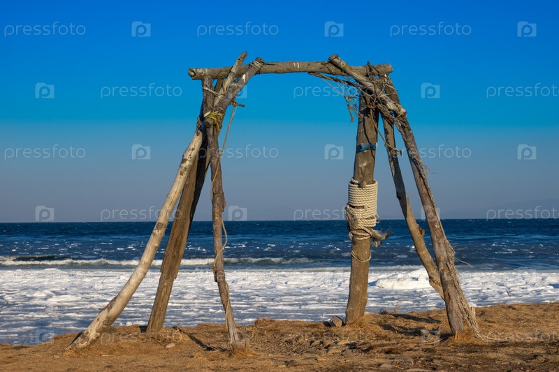 Деревянные качели на фоне моря зимой