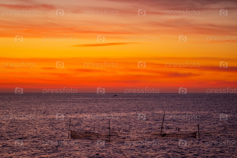 Морской пейзаж с ярко-оранжевым закатом