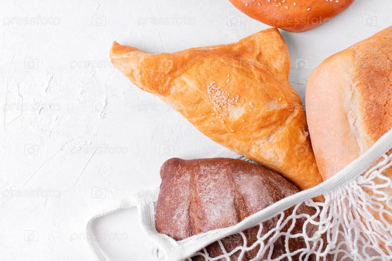 Хлебобулочные изделия в сетчатом мешке на белом столе. Слоеные хачапури, бездрожжевой ржаной хлеб и белый хлеб. Вид сверху