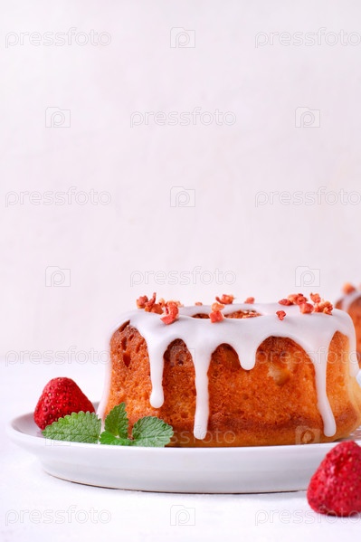 Мини-торт Bundt с глазурой из лимонного сахара и кусочками сублимированной клубники подается на керамической тарелке