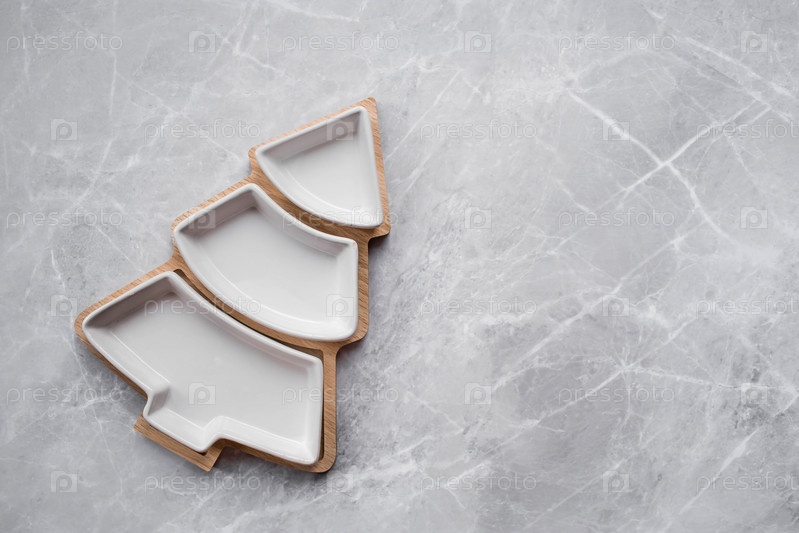 Сервировка стола. Тарелка в виде елки и столовые приборы на сером фоне. Концепция счастливого Рождества, Нового 2023 года и ресторанов