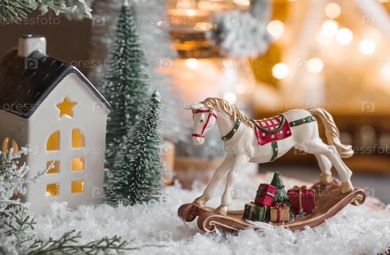 С Новым 2023 годом. Рождественская открытка, баннер с лошадкой-качалкой, елки, подарки и красивое боке на заднем плане. Концепция домашнего зимнего отдыха, тепла и уюта