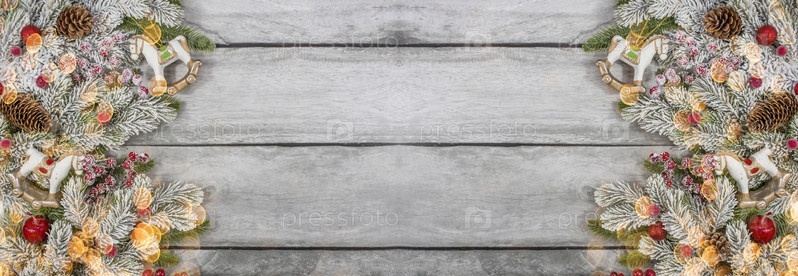 С Новым 2022 годом. Красивый рождественский баннер с боке. Еловые ветки, шишки, красные ягоды на сером деревянном фоне. Празднование рождественских праздников. Концепция начала года