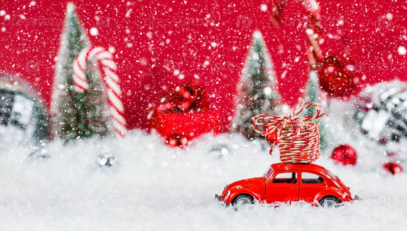 Рождественский красный ретро-автомобиль с подарочной коробкой в красном снежном пейзаже на фоне боке. Место для текста. Концепция доставки товаров и поздравительная открытка с Новым годом