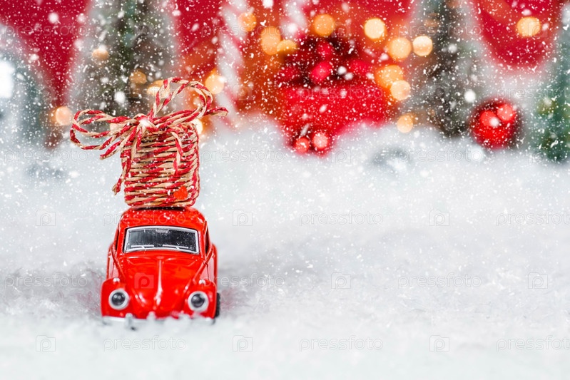 Рождественский красный ретро-автомобиль с подарочной коробкой в красном снежном пейзаже на фоне боке. Место для текста. Концепция доставки товаров и поздравительная открытка с Новым годом