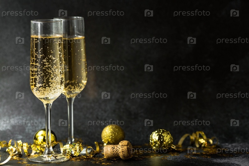 С Новым 2021 годом. Рождественские и новогодние праздники фон с копией пространства. Два бокала и олень шампанского с блестящими огнями на темном фоне