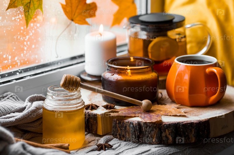 Осенний натюрморт с красивым боке. Чашка горячего чая, чайник, мед, свечи и вязаный плед на подоконнике. За окном осенние листья и капли дождя