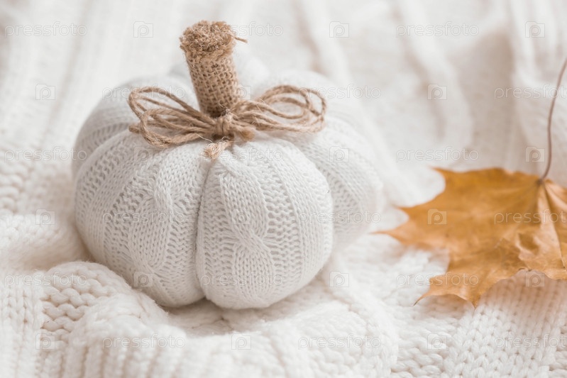 Белая вязаная тыква, осенние листья и белый вязаный плед. Стильная, теплая, уютная осенняя концепция