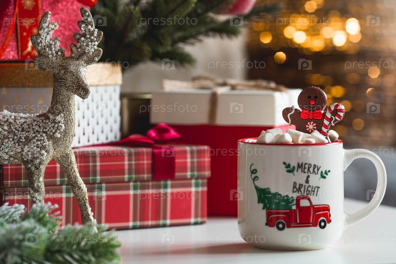 Подарочные коробки, кружка горячего какао, зефир и пряничный человечек на столе в домашнем интерьере гостиной. Уютная концепция Рождества и зимних праздников 2023