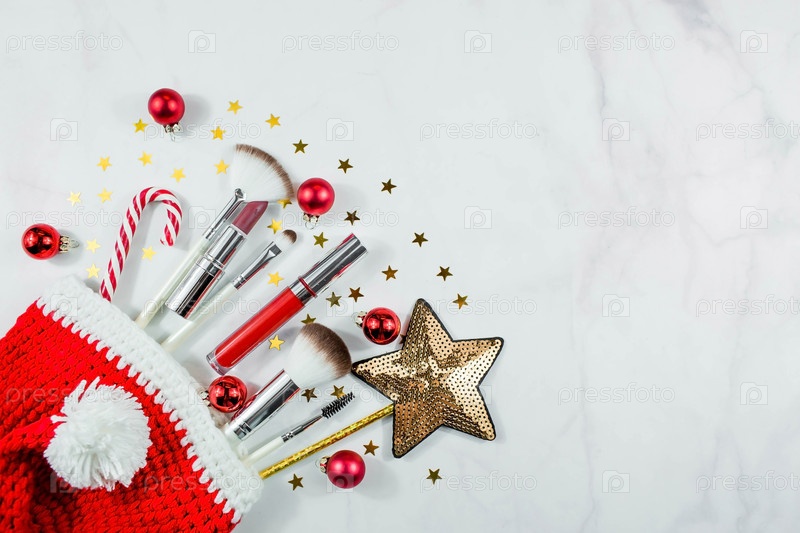 Баннер. Плоская композиция с декоративной косметикой и шляпой Санты на светлом фоне. Зимний уход. Понятие красоты и моды