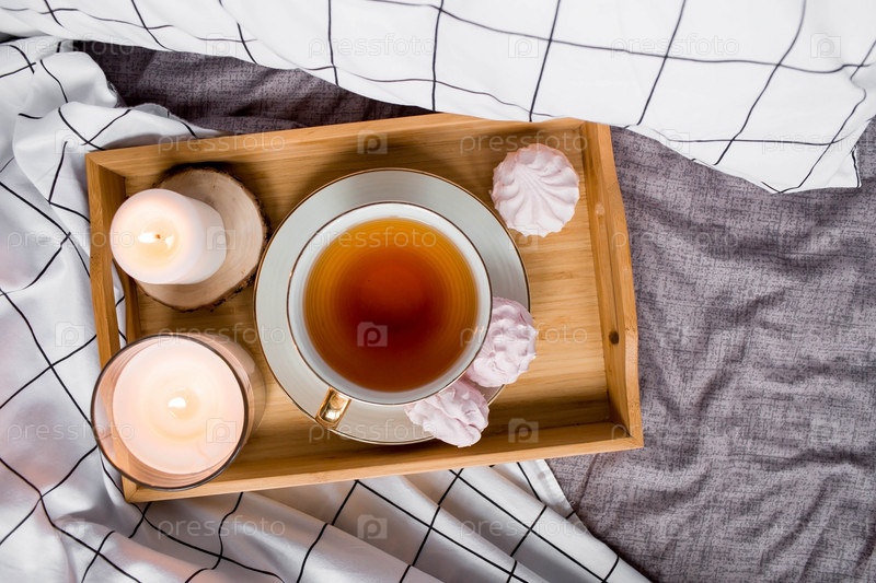 Деревянный поднос с чаем, зефиром и свечами на кровати. Белые простыни с полосатым одеялом и подушкой. Завтрак в постель