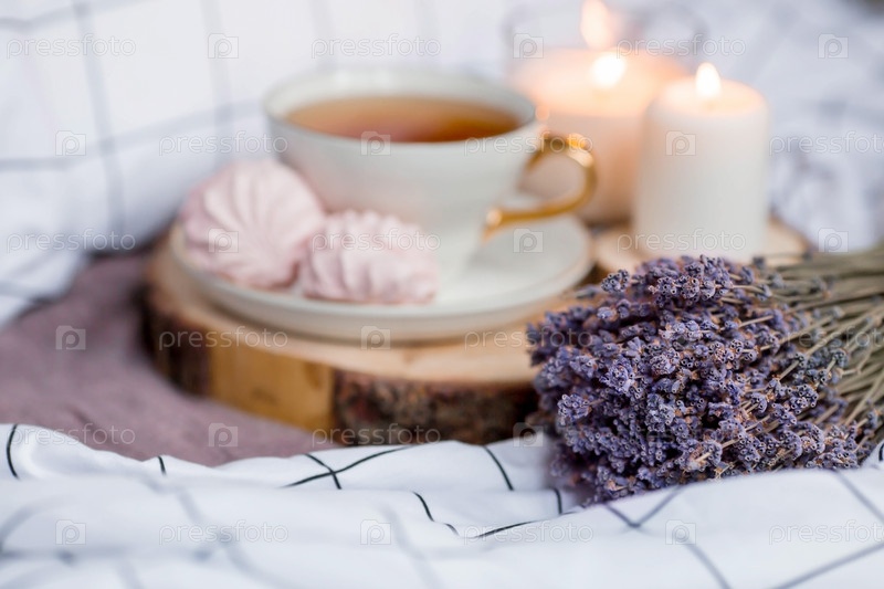 Деревянный поднос с чаем, зефиром, свечами и лавандой на кровати. Белые простыни с полосатым одеялом и подушкой. Завтрак в постель