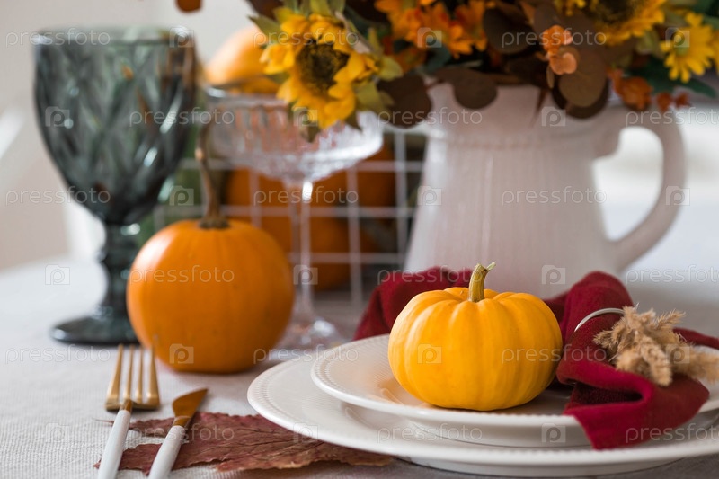 Красивая осенняя сервировка стола. Тарелка с хлопчатобумажной салфеткой и тыквой. Столовое золото и ваза с осенними цветами на льняной скатерти. Концепция праздничной сервировки на День Благодарения
