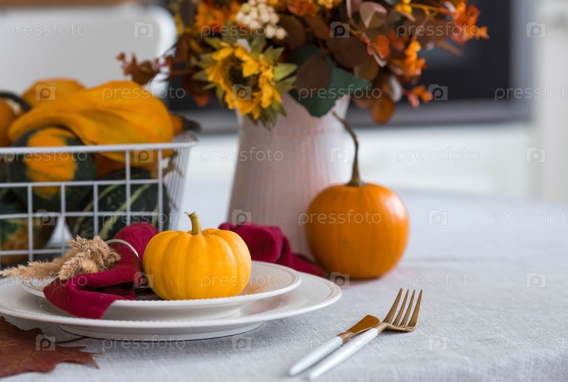 Красивая осенняя сервировка стола. Тарелка с хлопчатобумажной салфеткой и тыквой. Столовое золото и ваза с осенними цветами на льняной скатерти. Концепция праздничной сервировки на День Благодарения