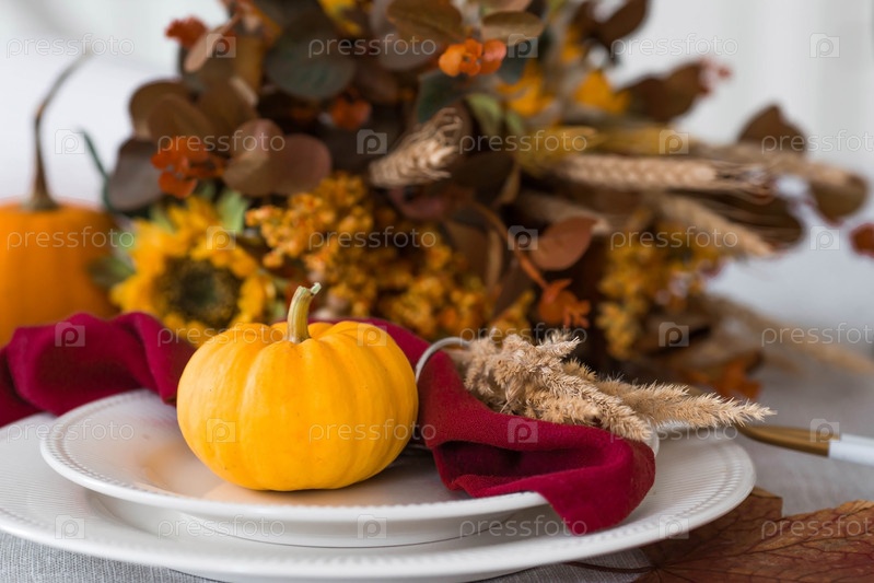 Красивая осенняя сервировка стола. Тарелка с хлопчатобумажной салфеткой и тыквой. Столовое золото и ваза с осенними цветами на льняной скатерти. Концепция праздничной сервировки на День Благодарения