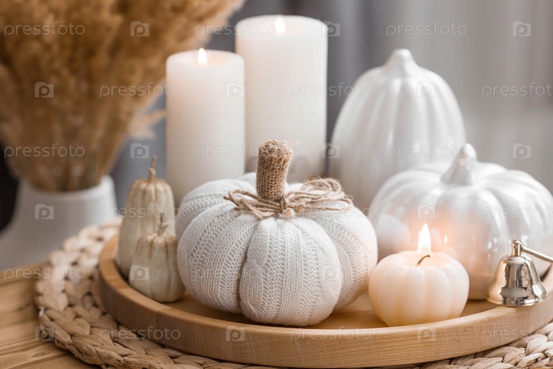 Натюрморт. Вязаная тыква, пампасная трава, свечи в форме тыквы и белые керамические тыквы на деревянном подносе на журнальном столике в домашнем интерьере гостиной. Уютная осенняя концепция