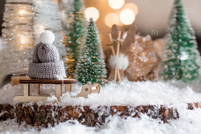 С Новым 2022 годом. Красивый фон со свечами, санками с вязаной шапкой, елками и украшениями. Празднование зимних рождественских каникул. Концепция начала года