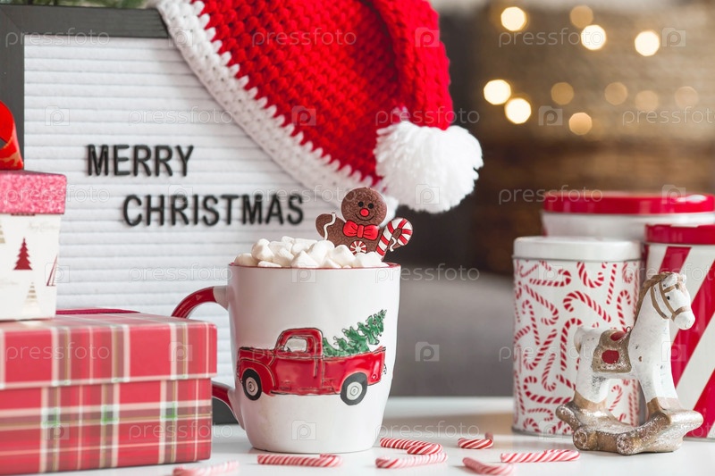 Подарочные коробки, кружка горячего какао, зефир и пряничный человечек на столе в домашнем интерьере гостиной. Уютная концепция Рождества и зимних праздников 2023