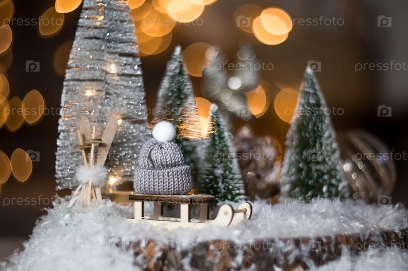 С Новым 2022 годом. Красивый фон со свечами, санками с вязаной шапкой, елками и украшениями. Празднование зимних рождественских каникул. Концепция начала года