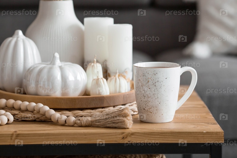 Натюрморт. Сухая пампасная трава в вазе, белые керамические тыквы, чайник, чашка и свечи в форме тыквы на журнальном столике в домашнем интерьере гостиной. Уютная осенняя концепция