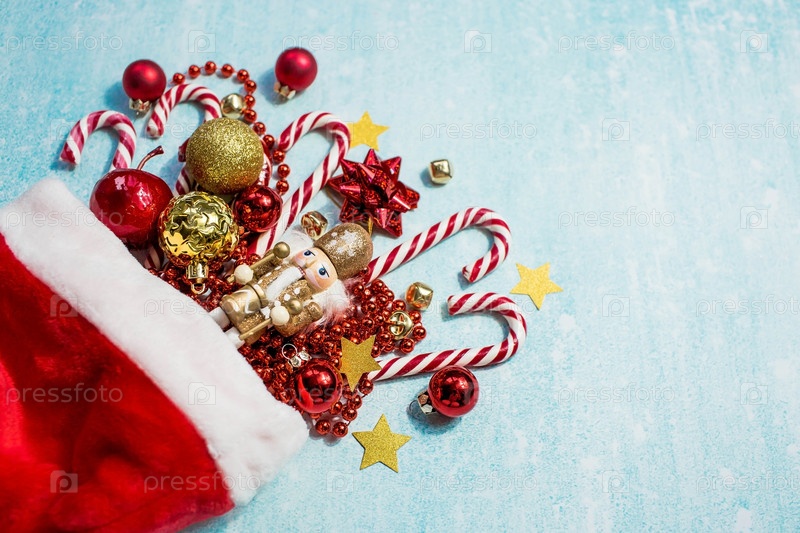 Рождественская шапка Санта-Клауса с рождественскими конфетами, игрушками и блестками на синем фоне. Минимальная рождественская концепция. Карамельная трость. Копия текстового пространства