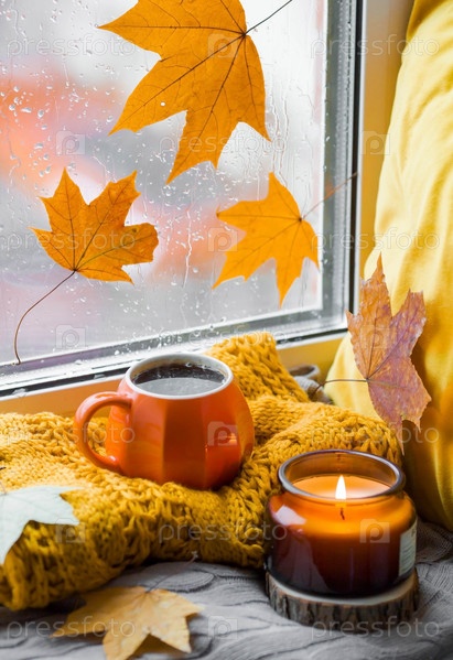 Осенний натюрморт с красивым боке. Чашка горячего чая, свечи и вязаный плед на подоконнике. За окном осенние листья и капли дождя