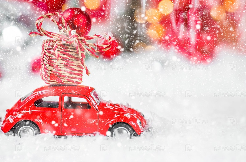 Рождественский красный ретро-автомобиль с подарочной коробкой в красном снежном пейзаже на фоне боке. Место для текста. Концепция доставки товаров и поздравительная открытка с Новым годом