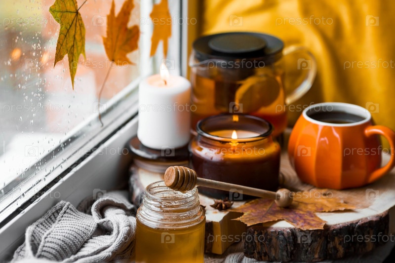 Осенний натюрморт с красивым боке. Чашка горячего чая, чайник, мед, свечи и вязаный плед на подоконнике. За окном осенние листья и капли дождя